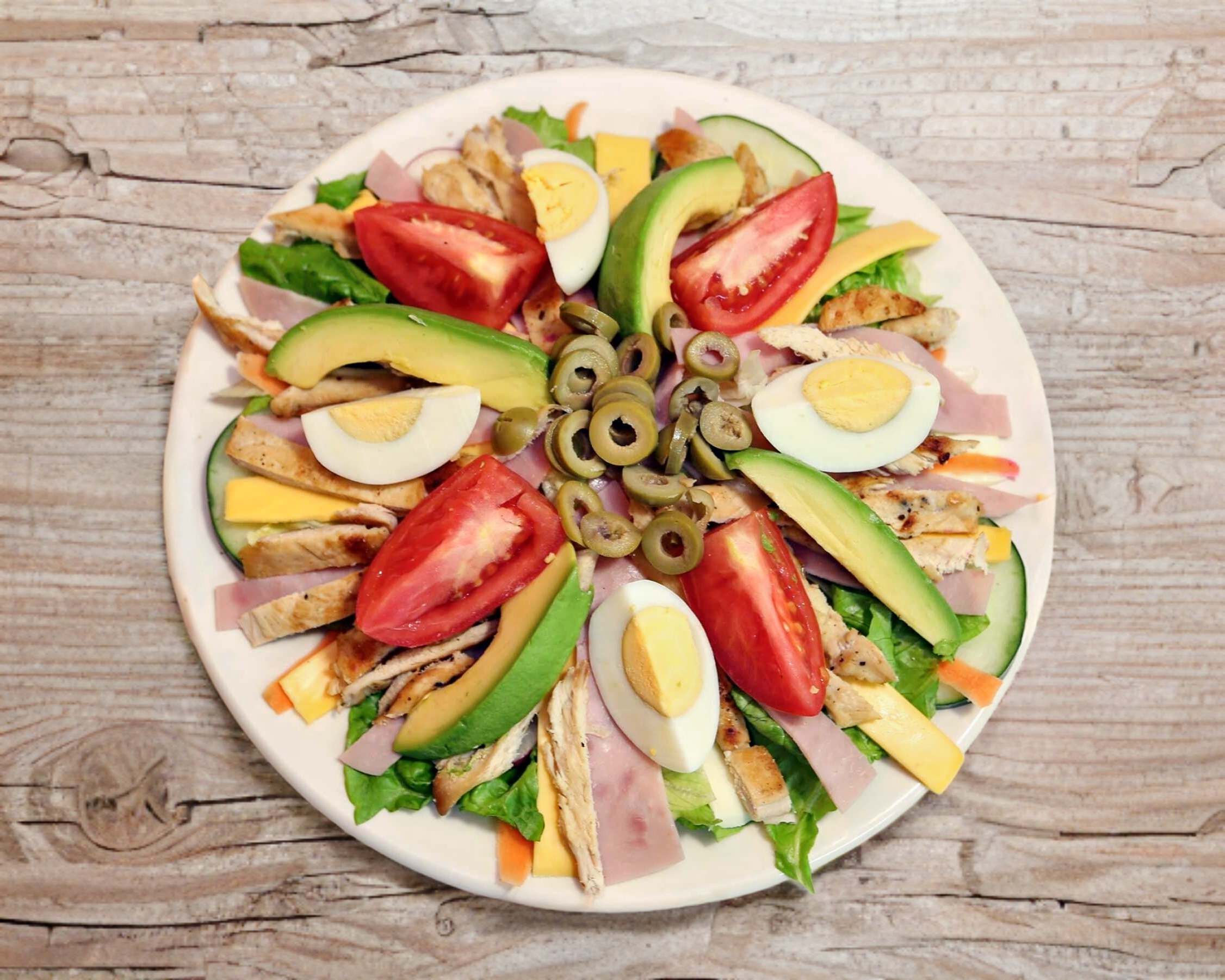 Una cama de lechuga mixta con tiras de queso panela, tiras de queso amarillo, tiras de jamón de pavo, tiras de fajitas de pollo a la plancha, gajos de tomate, aguacate, huevo duro y aceitunas verdes