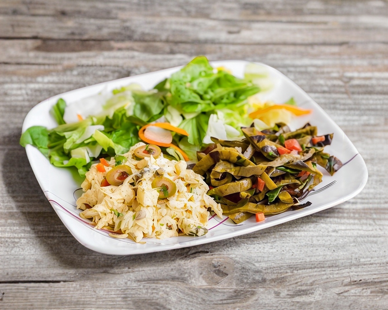 Combinado de 2 ensaladas su elección, acompañado con lechuga mixta galletas saladas, chiles y aderezo.