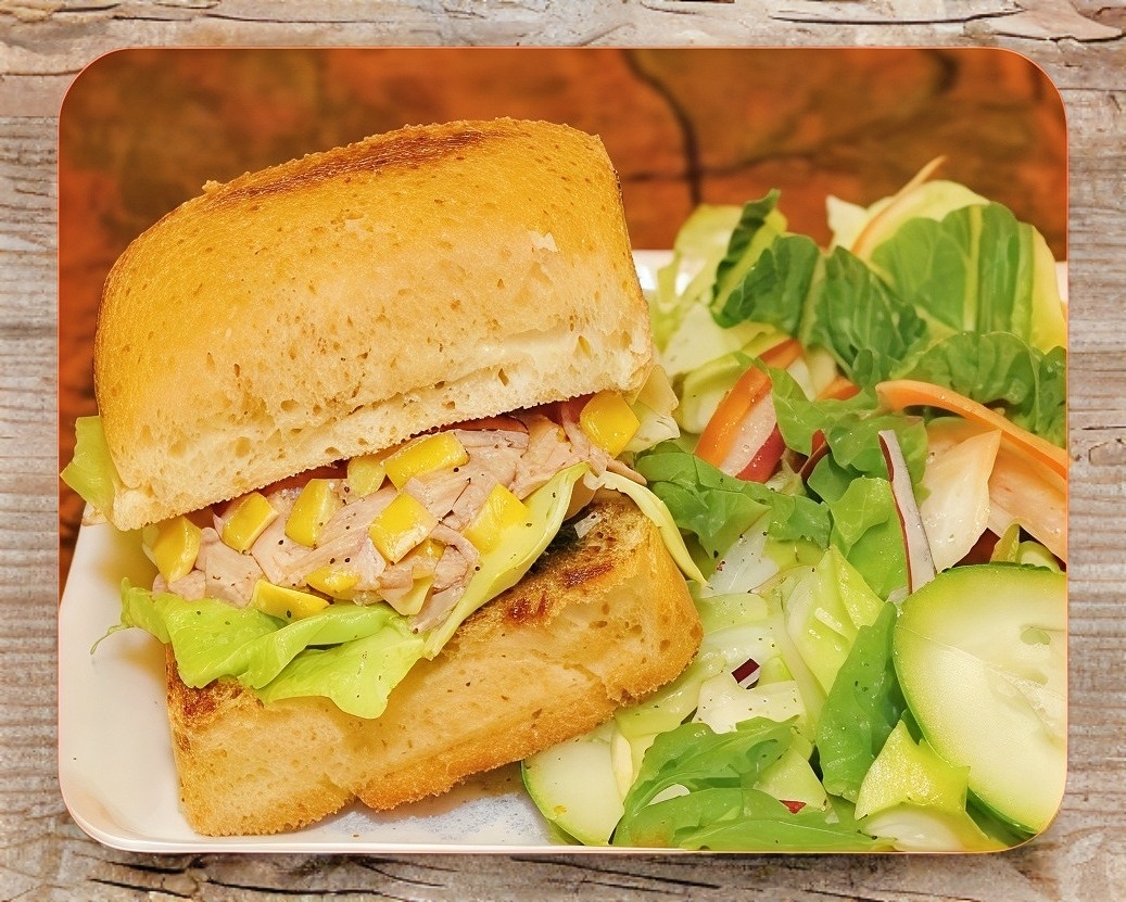 Sandwich de pan integral, relleno de una ensalada a elección de proteína. Sobre una cama de lechuga mixta. Acompañado de 1 aderezo a elección y chiles jalapeños