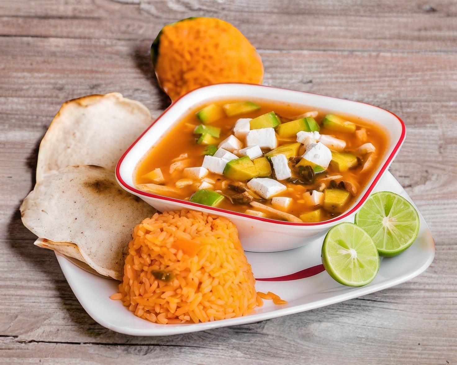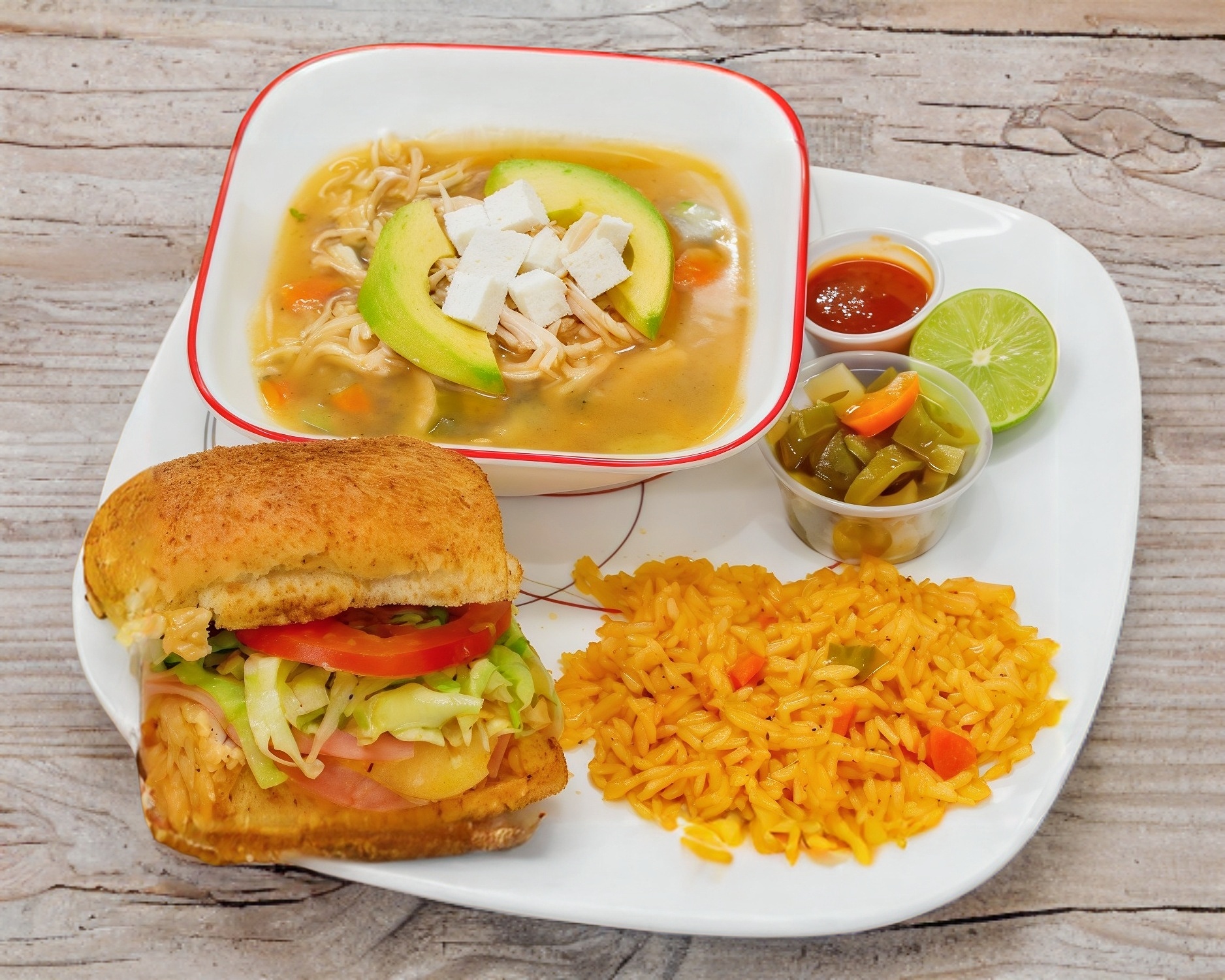 Panini integral con jamón de pavo, queso panela, tomate, lechuga y aguacate y caldo tlalpeño. Acompañado con chile chipotle (1oz.) Y limón. Tortillas (3 piezas) o pan (2 piezas) o tostadas horneadas (2 piezas)