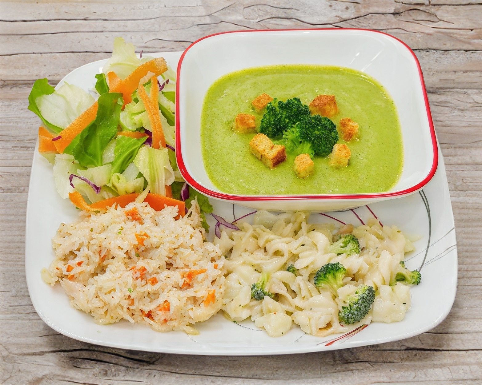 Crema de papa, con tocino o brocoli más 2 ensaladas su elección, acompañado con lechuga mixta galletas saladas, chiles y aderezo