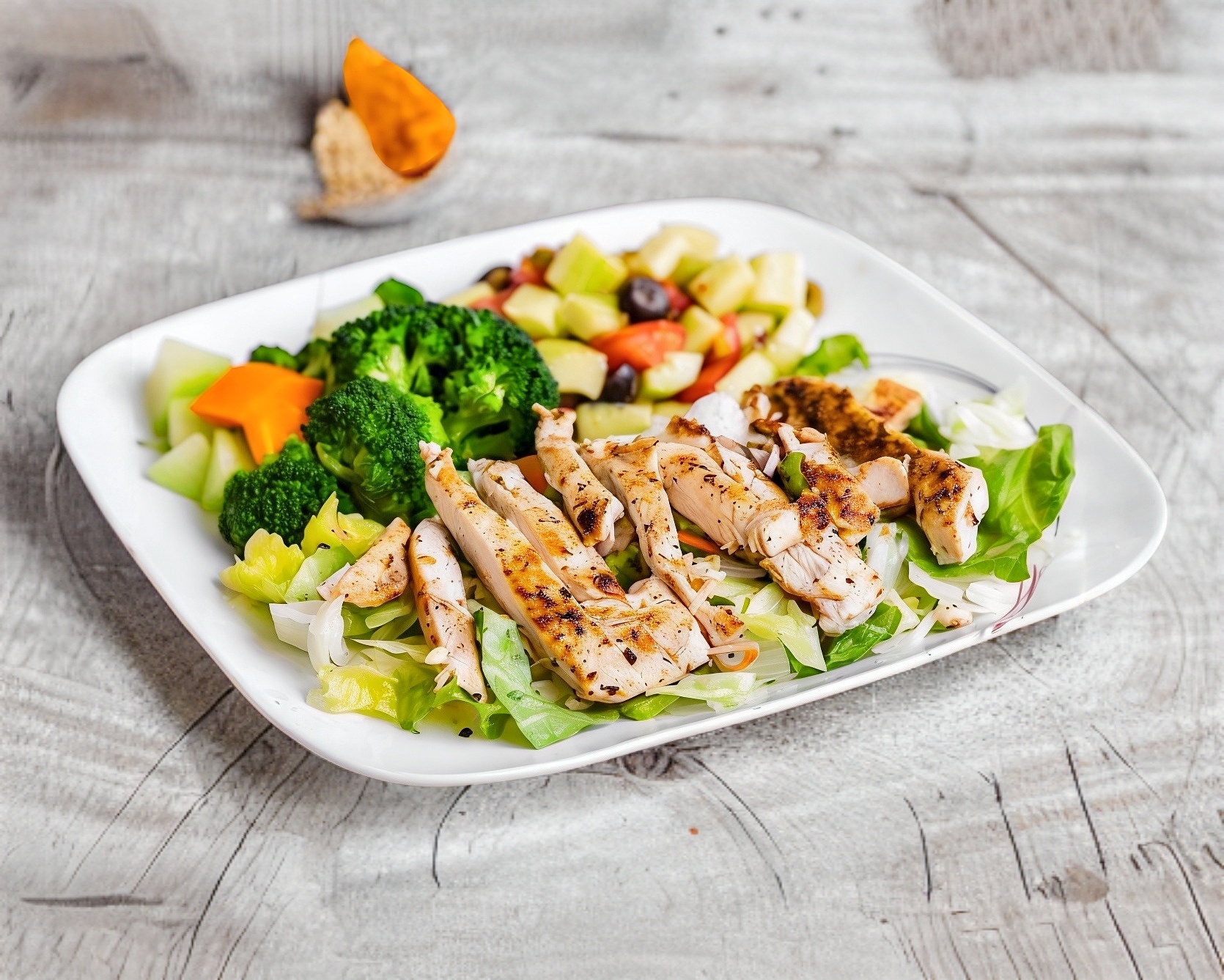 Fajita de pollo a la plancha mas 2 ensaladas a su eleccion, acompañado con lechuga mixta,galletas saladas, chiles y aderezo