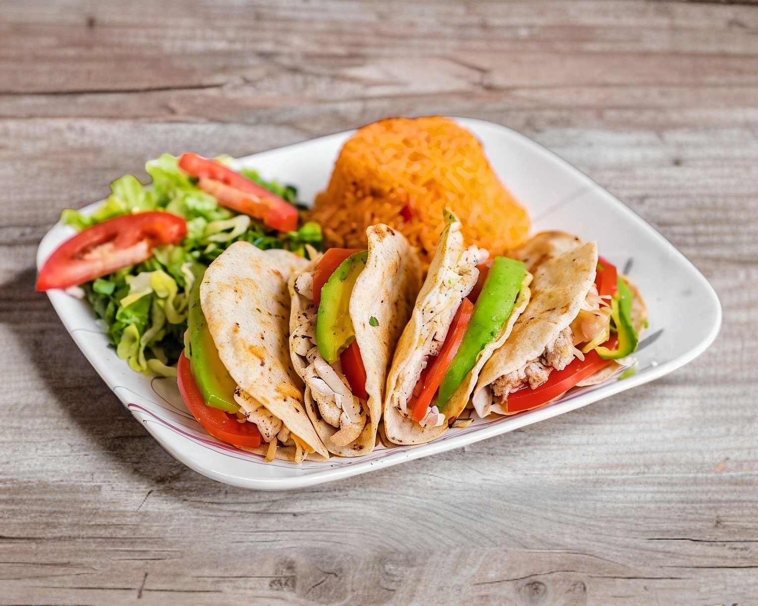4 Tacos de pechuga o de queso acompañados con arroz, lechuga, tomate y aguacate.