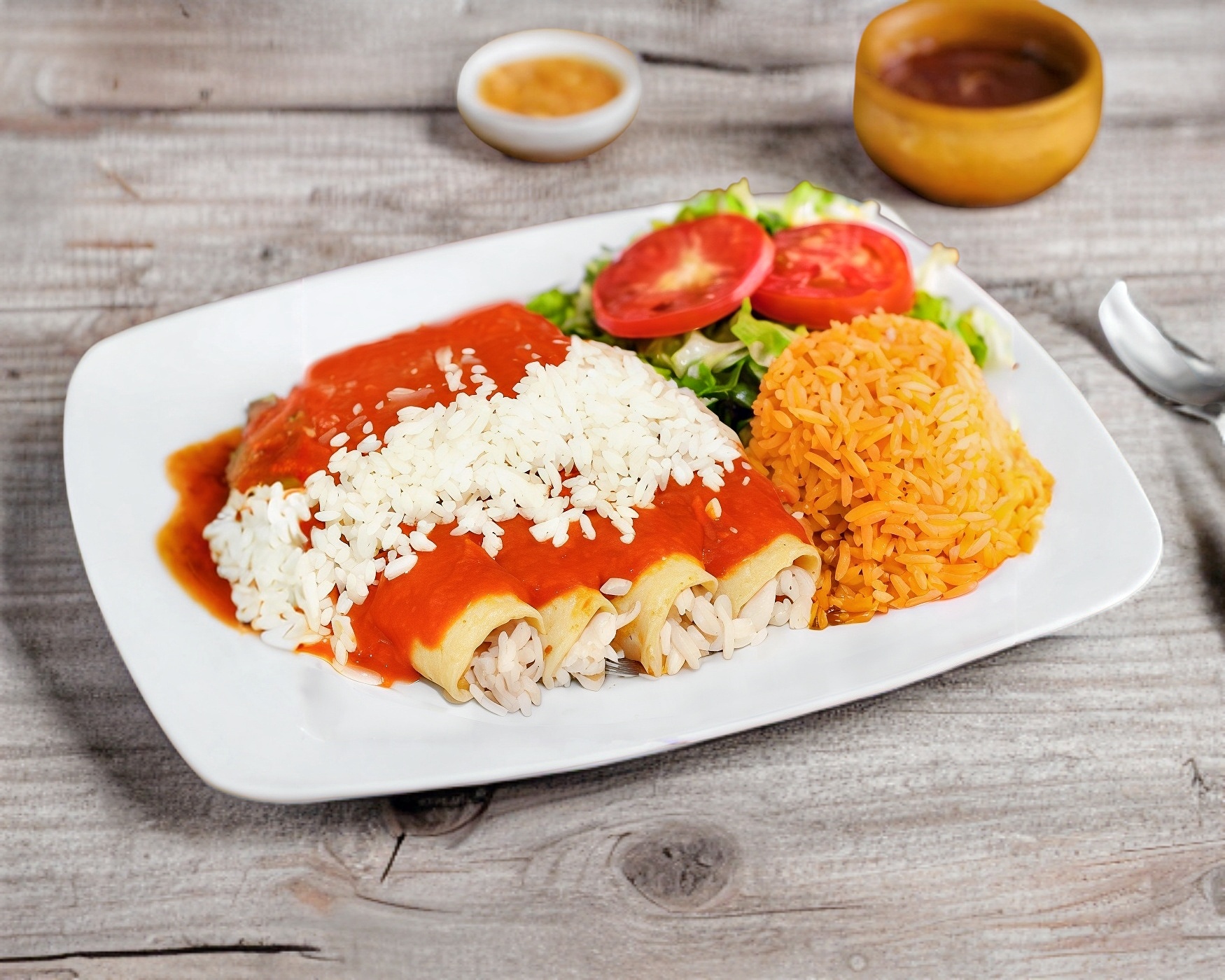4 Tacos de pechuga o de queso bañados en salsa de tomate o rojo, acompañados de arroz, lechuga y tomate.