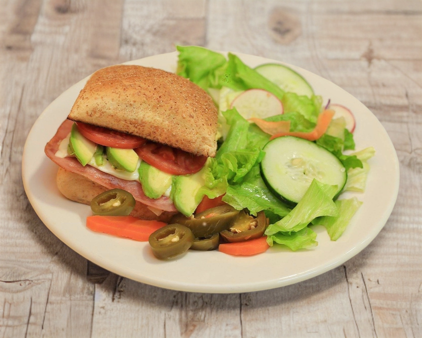 Sándwich de pan integral con jamón de pavo, queso panela. Lechuga, aguacate, tomate. Sobre una cama de lechuga mixta. Acompañado con 1 aderezo a elección y chiles jalapeños