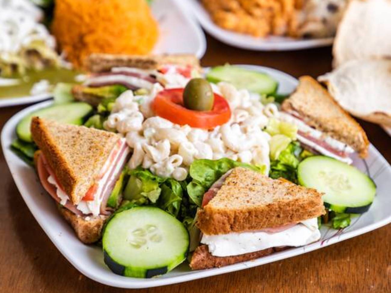 Panini de jamón de pavo, más 2 ensaladas su eleccion, acompañado con lechuga mixta galletas saladas, chiles y aderezo.