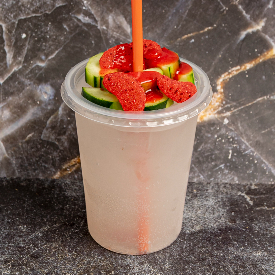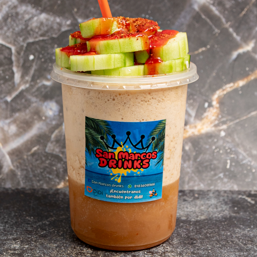 Camarón, pepino, cacahuate, fritos y salsa al gusto.