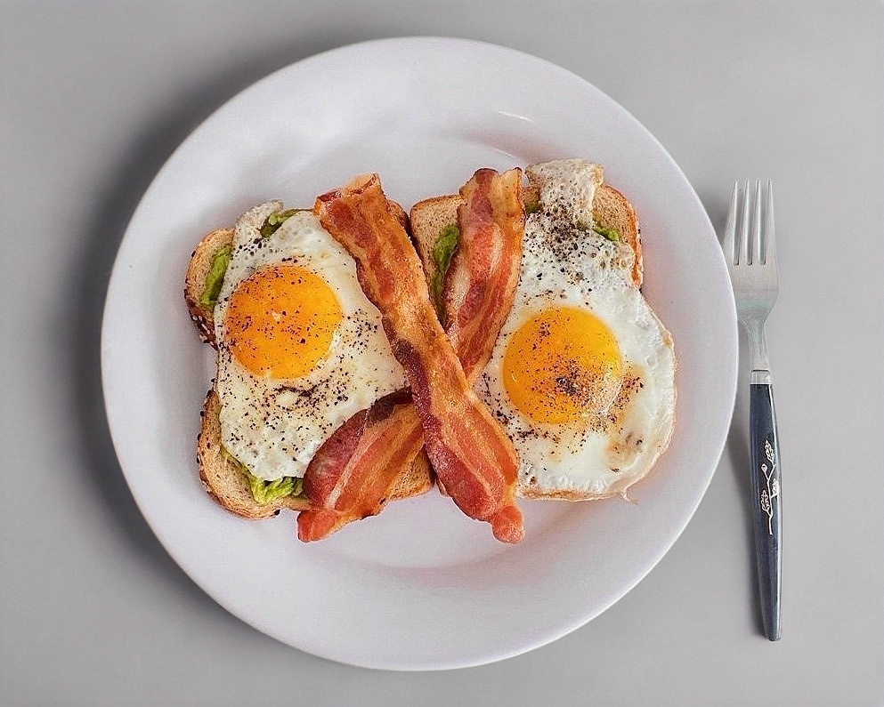 2 panes tostados con aguacate, huevo estrellado y tocino.