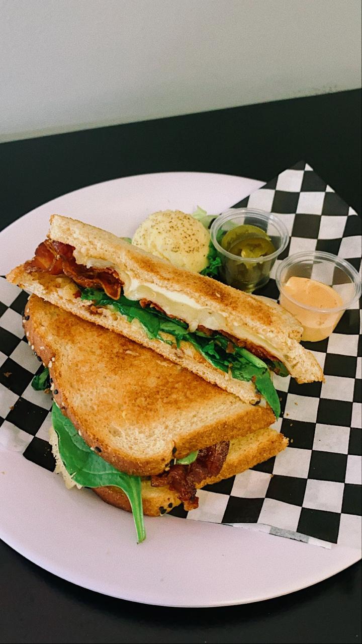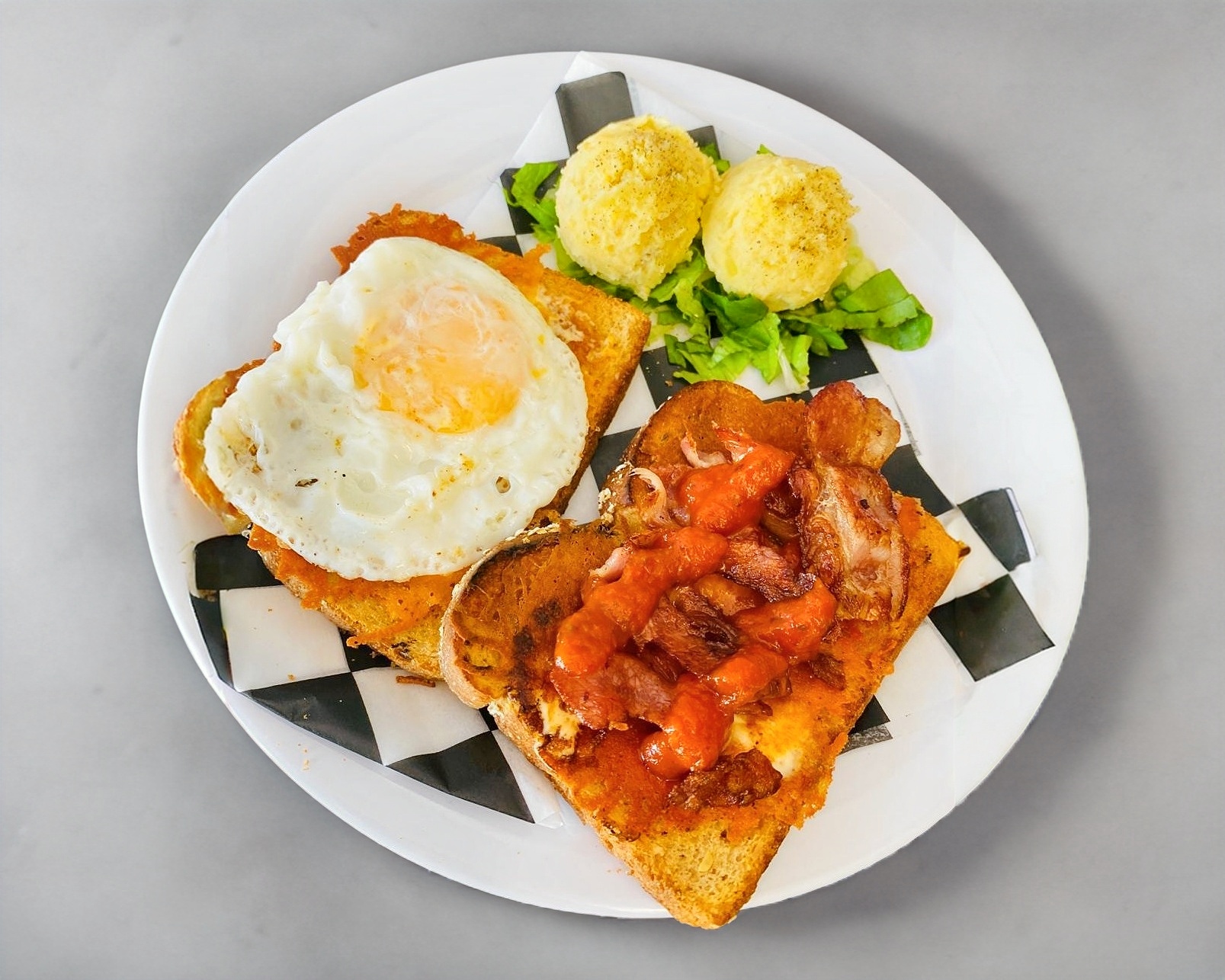 Huevo, queso cheddar, tocino y salsa de tomate.