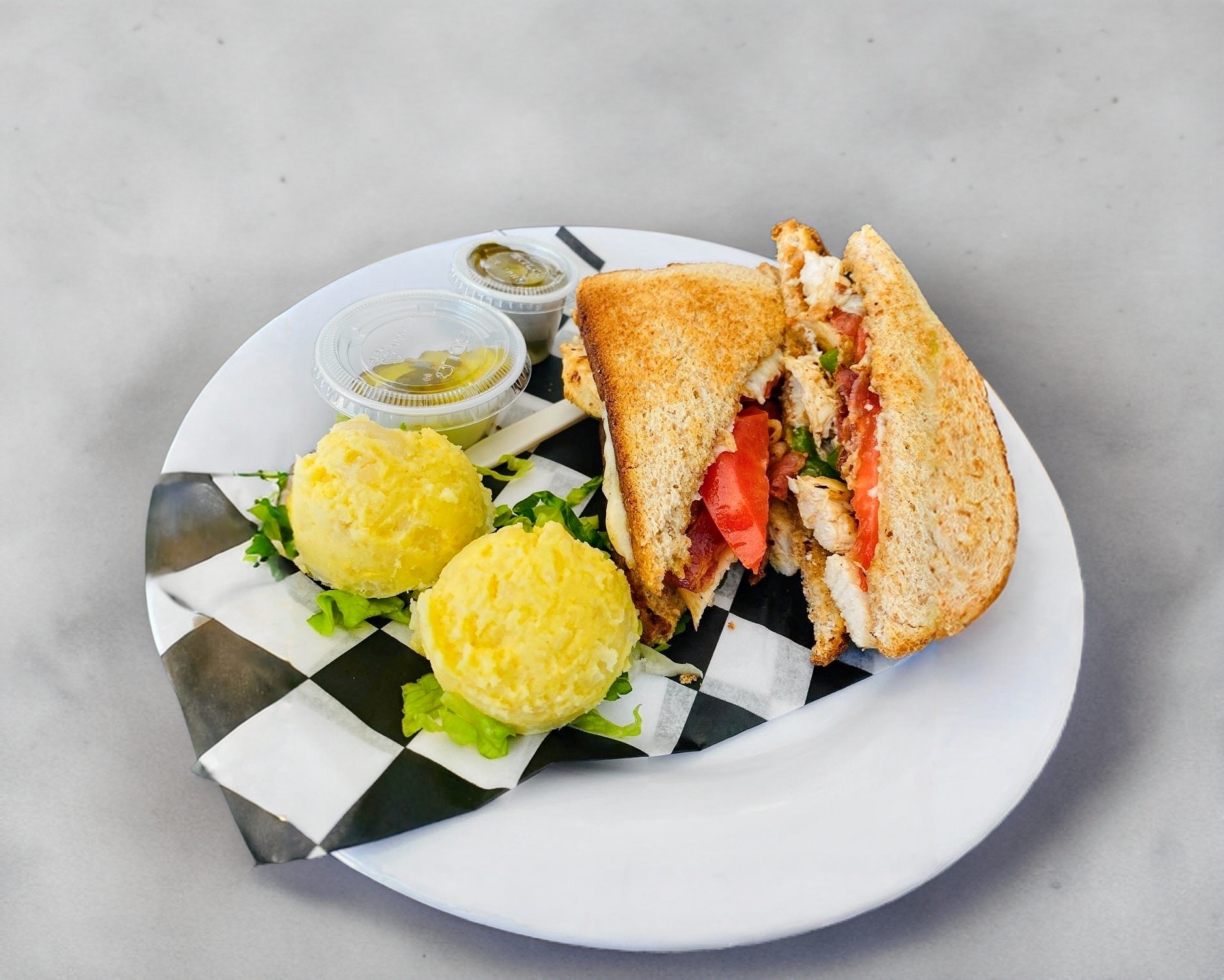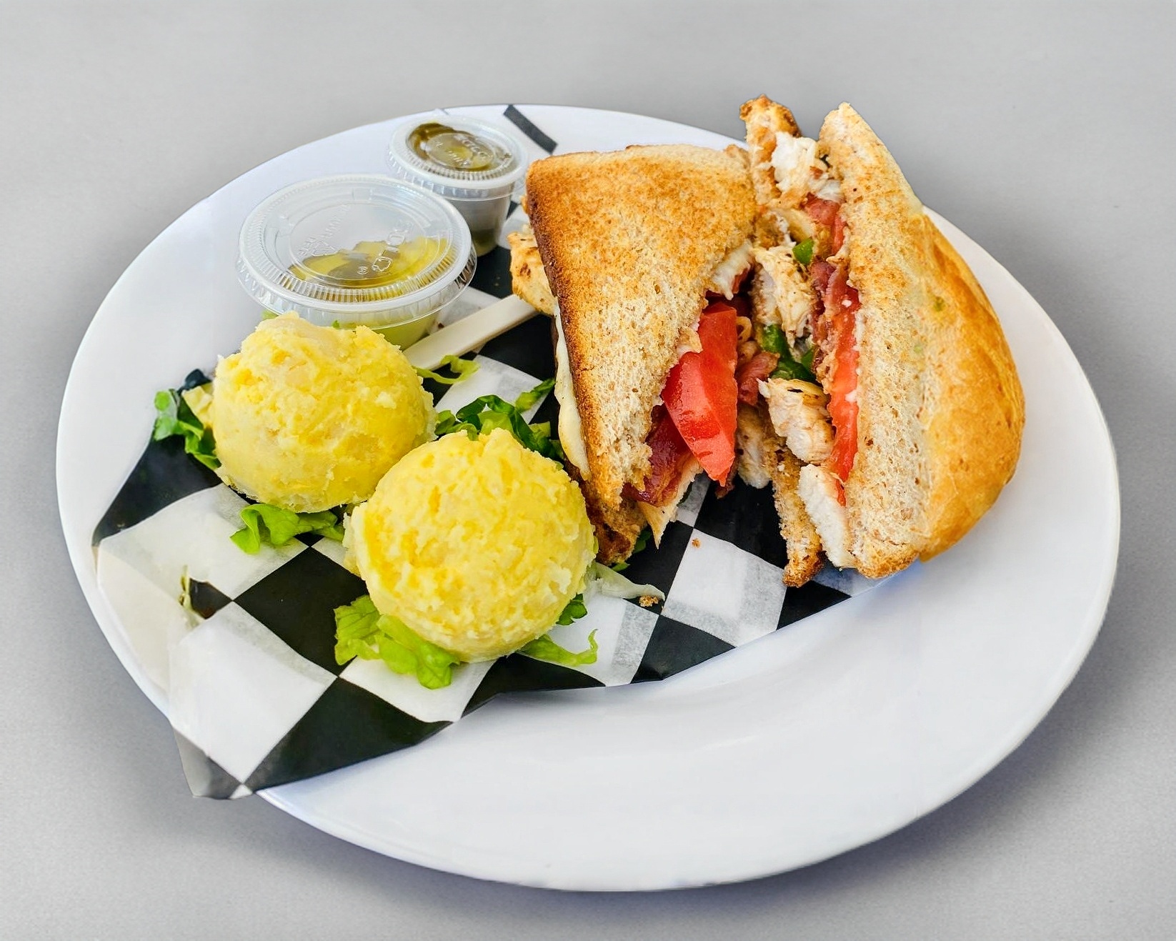 1 90 gr Pollo a la plancha, queso manchego, tocino,aguacate, lechuga y chipotle.