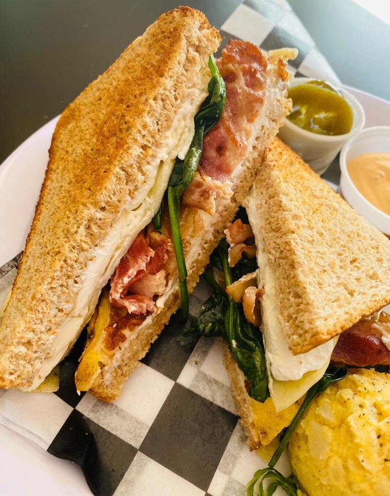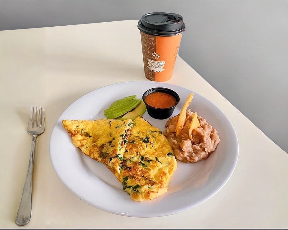 omelette con espinaca, queso suizo, aguacate, tocino
