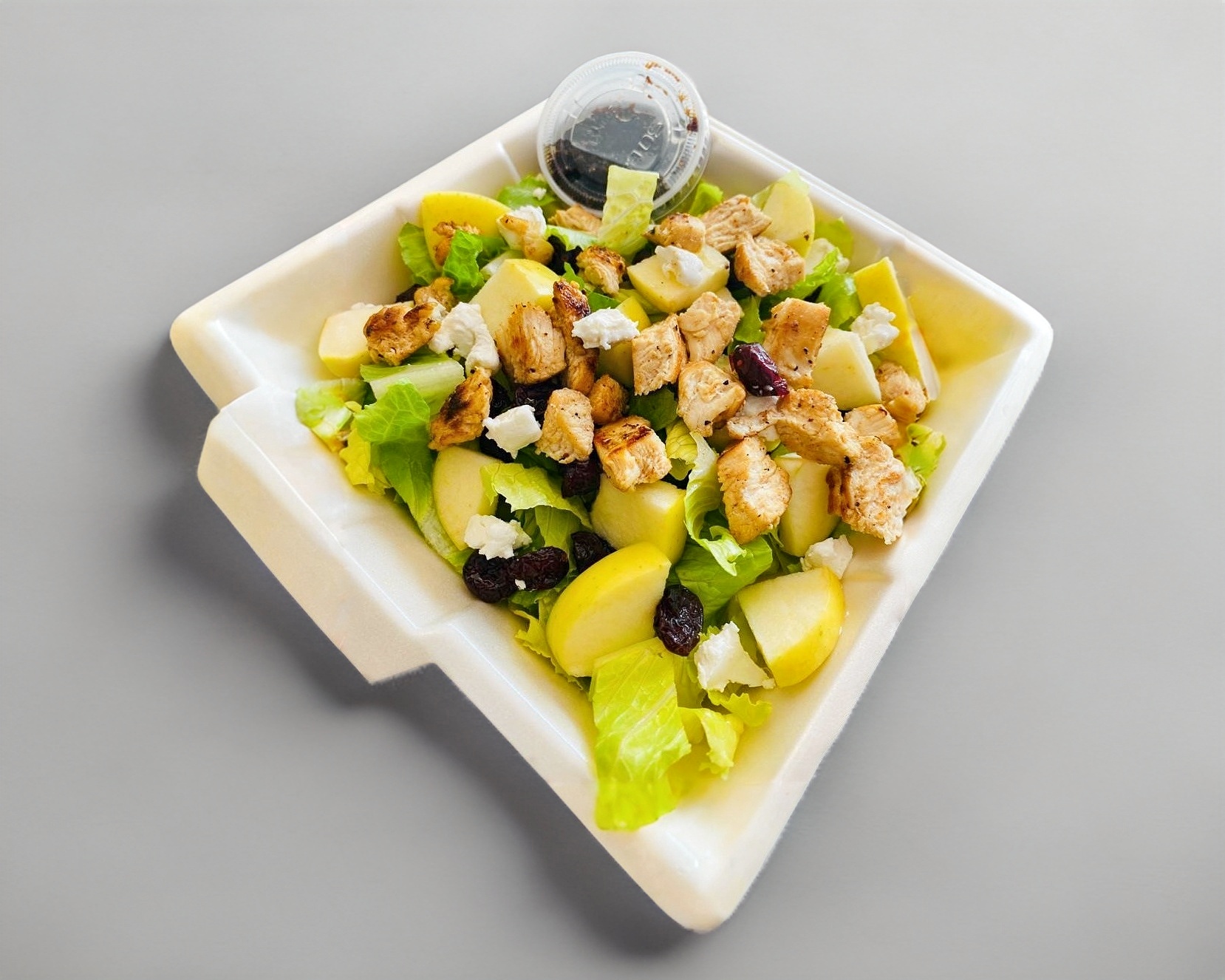 Lechuga, manzana, arándanos, queso de cabra, nuez, vinagreta .