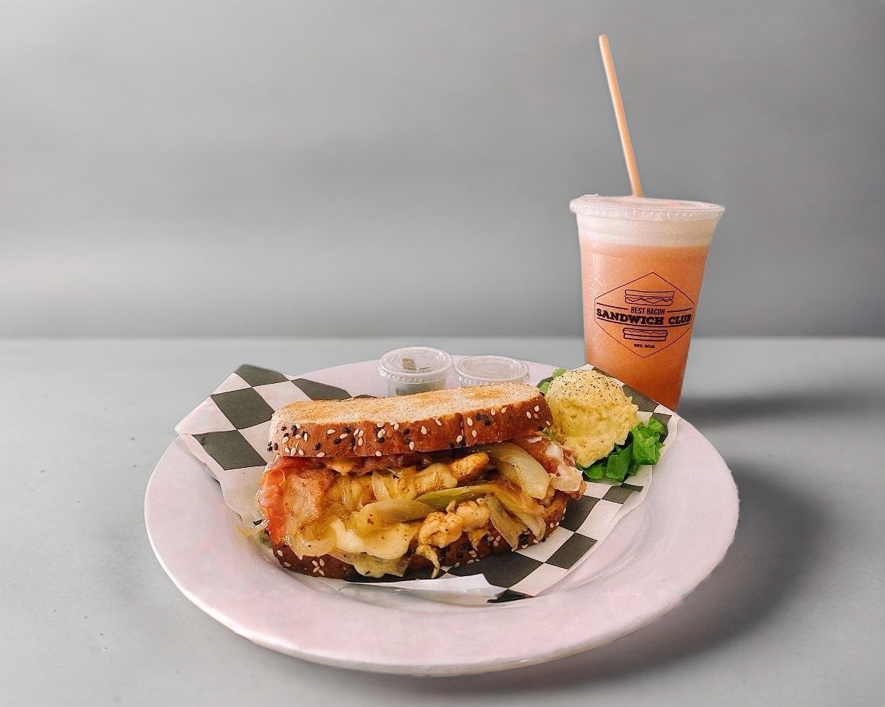 Pollo a la plancha, queso manchego, cebolla caramelizada, tocino y aderezo de chipotle.