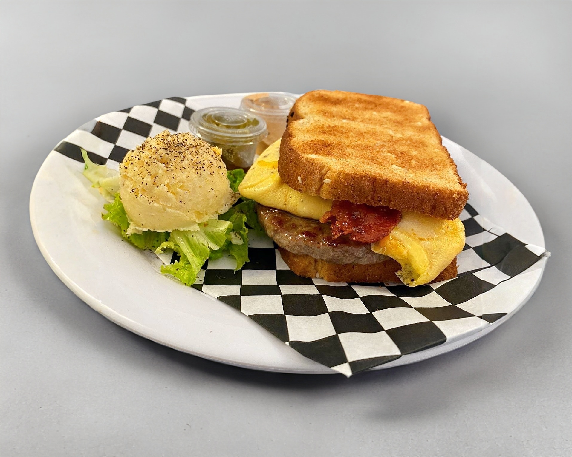 Carne de hamburguesa, omelette, queso cheddar y tocino.