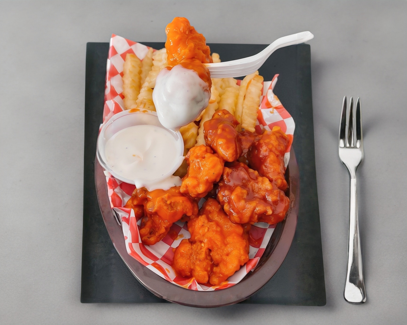 Papas a la francesa, queso amarillo, salsa buffalo y aderezo.