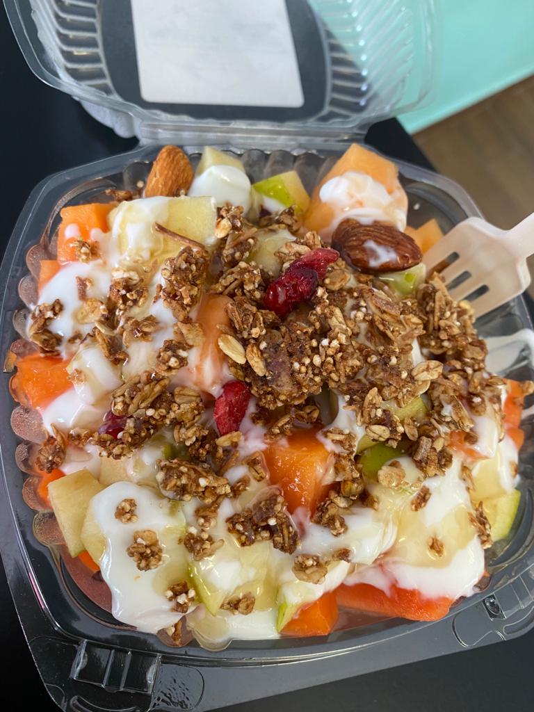Melón, papaya y manzana con yogurt natural, miel y granola.