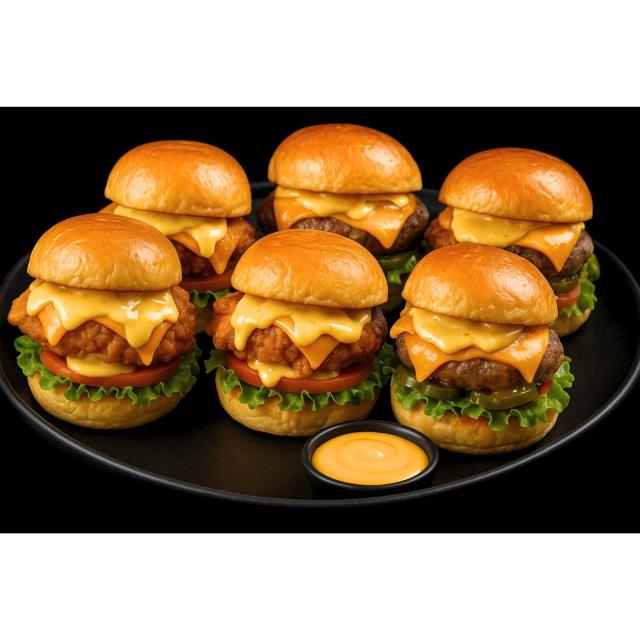 6 Nano burgers - 3 cheese burgers de res y 3 Santa Moritas de pechuga de pollo empanizada con salsa de queso para dippear y papas a la francesa