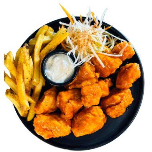 250grs. de trozos de pechuga de pollo empanizada en casa, bañados en tu salsa favorita acompañados de papas a la francesa.
