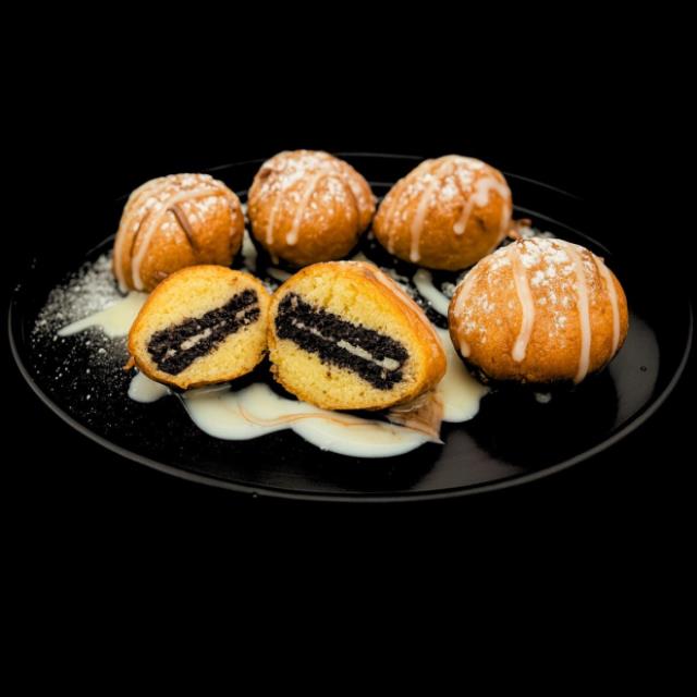 5 Deliciosas galleta oreo cubierta de masa de hotcakes, bañada con nutella, lechera y azucar glass.