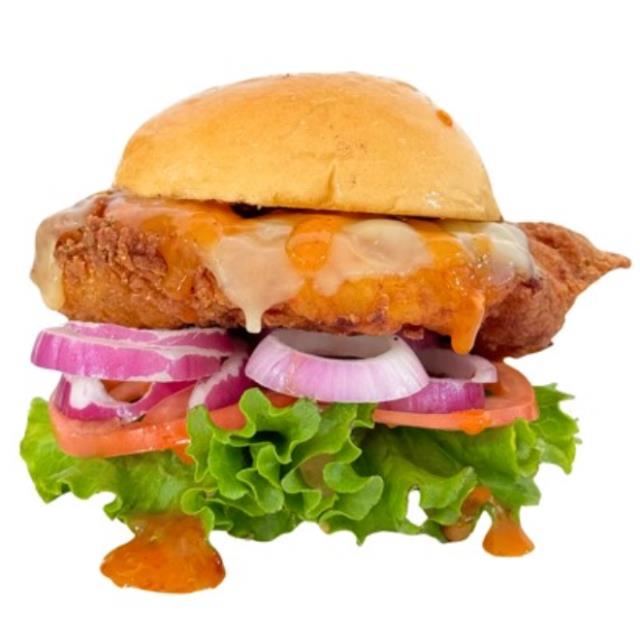 Sacrosanta burger con pechuga de pollo empanizada bañada en nuestra salsa Honey Piquin, queso cheddar, queso pepper jack, tomate, lechuga y cebolla.