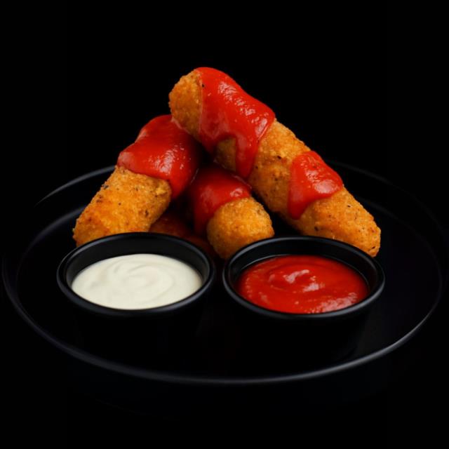 5 dedos de queso mozzarella hechos en casa acompañados de aderezo chipotle y salsa marinara.