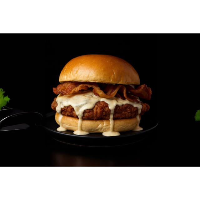 Pechuga de Pollo empanizada, queso pepper jack, queso cheddar, tocino y nuestro aderezo cremoso de PIQUIN