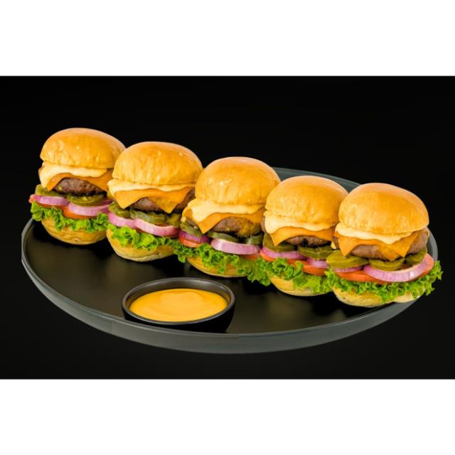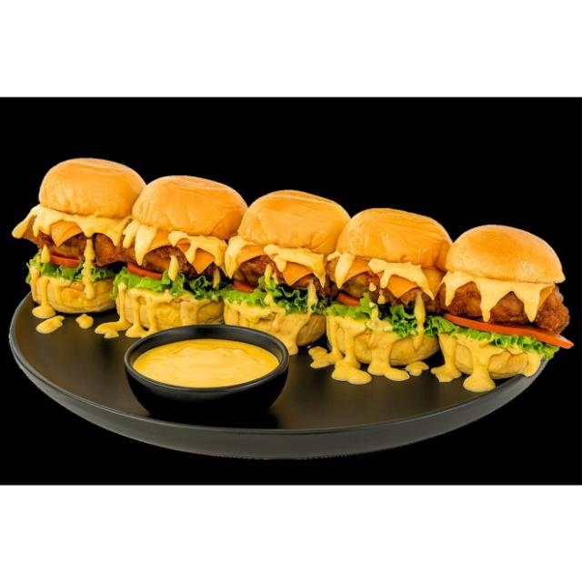 5 nano burgers Santa Morita de pechuga de pollo empanizada, con papas fritas y salsa de queso para dipear.