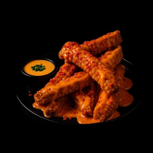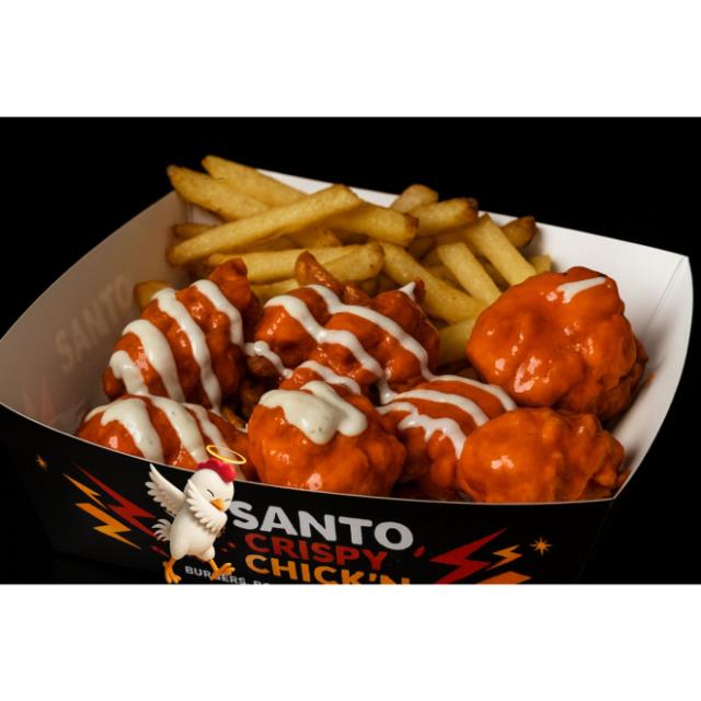 250grs. de trozos de pechuga de pollo empanizada en salsa buffalo, bañados con salsa de queso, tocino y una cama de papas fritas.