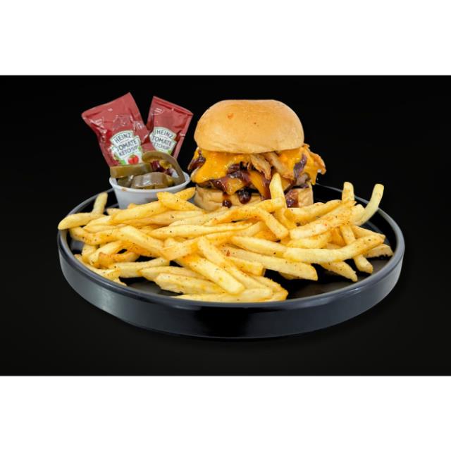 Consagrada burger de res, con salsa BBQ, tiras de cebolla frita, tocino y mucho queso Cheddar.