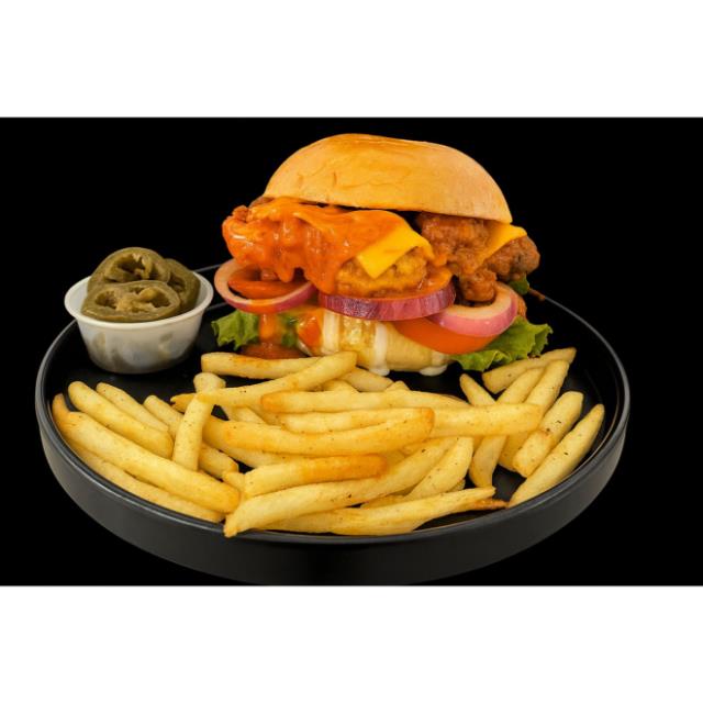 Inmaculada burger de pechuga de pollo empanizada, bañada en salsa buffalo, queso cheddar, lechuga, tomate y cebolla morada.