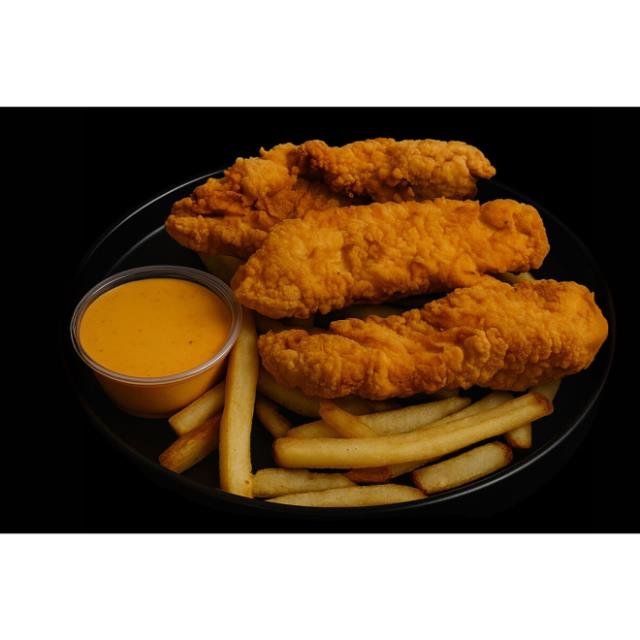 3pz (150grs) de tenders de pollo empanizados con papas fritas y nuestro aderezo de la casa