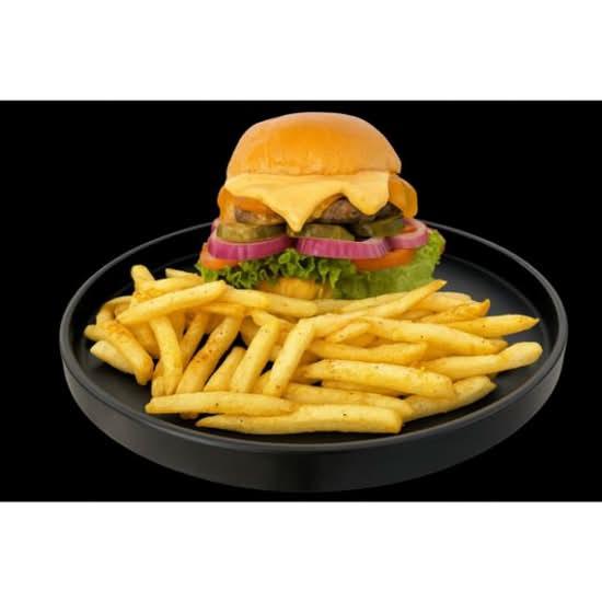 Carne de res, queso cheddar, tomate , lechuga, pepinillos, cebolla y aderezo de la casa