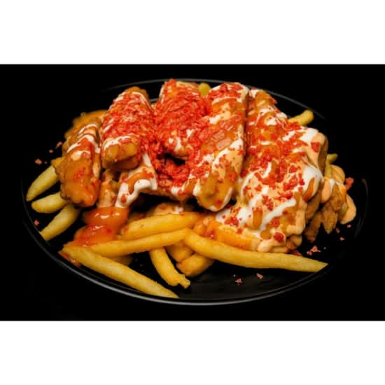 Papas fritas, pechuga empanizada con salsa buffalo, salsa de queso, ad chipotle, morita, ranch y tostitos flamin hot