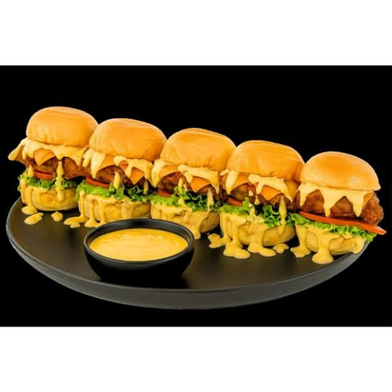 5 Nano burgers de res con queso cheddar, lechuga, tomate y salsa de queso