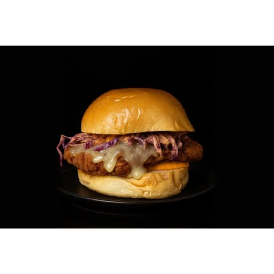 Pechuga empanizada, queso cheddar, salsa bbq, tocino y cebolla frita