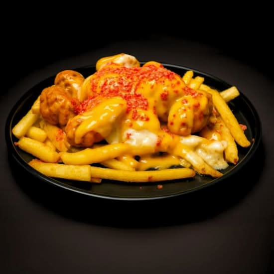 Papas bañadas con salsa de queso, queso pepper y tostitos flamin hot