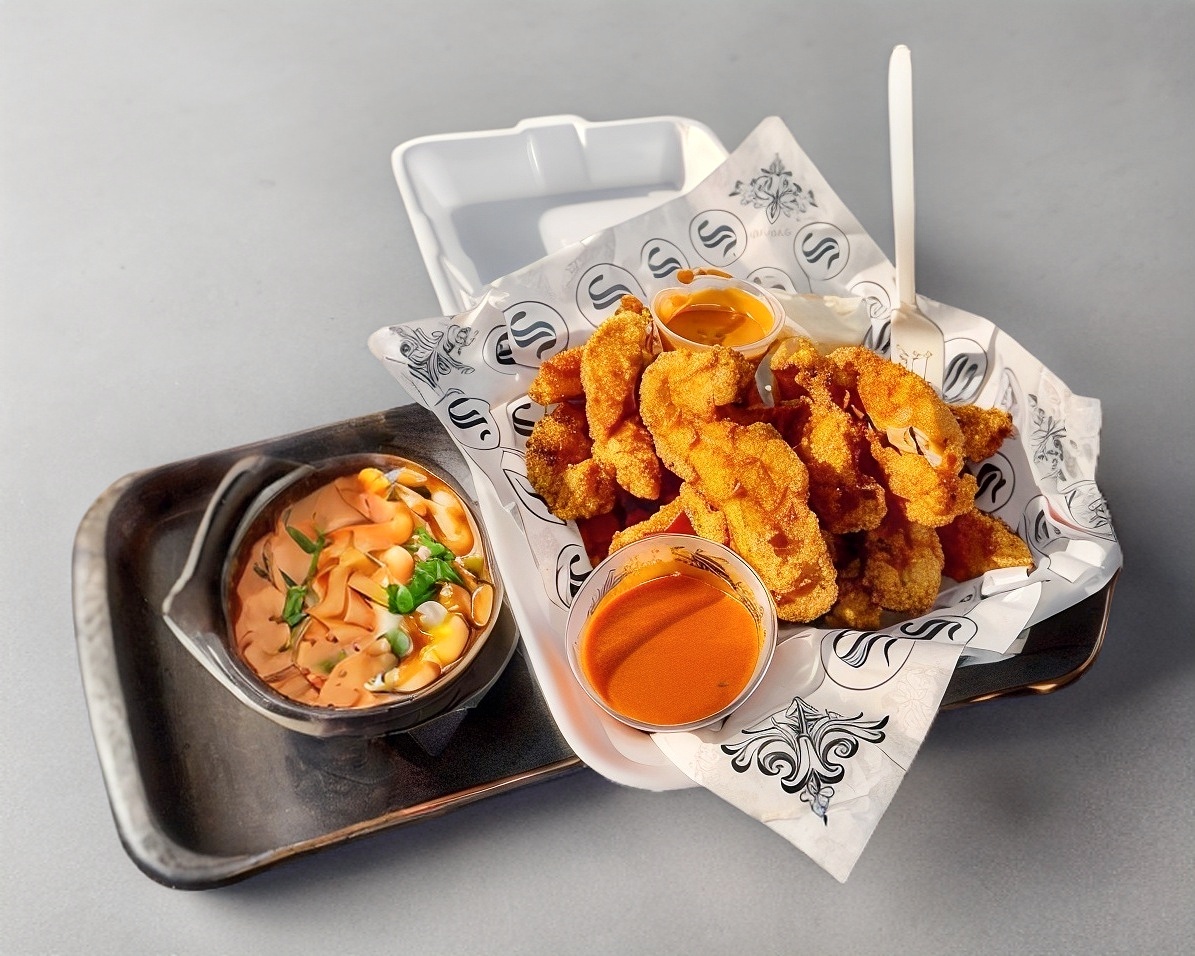 4 Tiras de pollo en tu salsa preferida, papas a la francesa y 1 aderezo ranch.