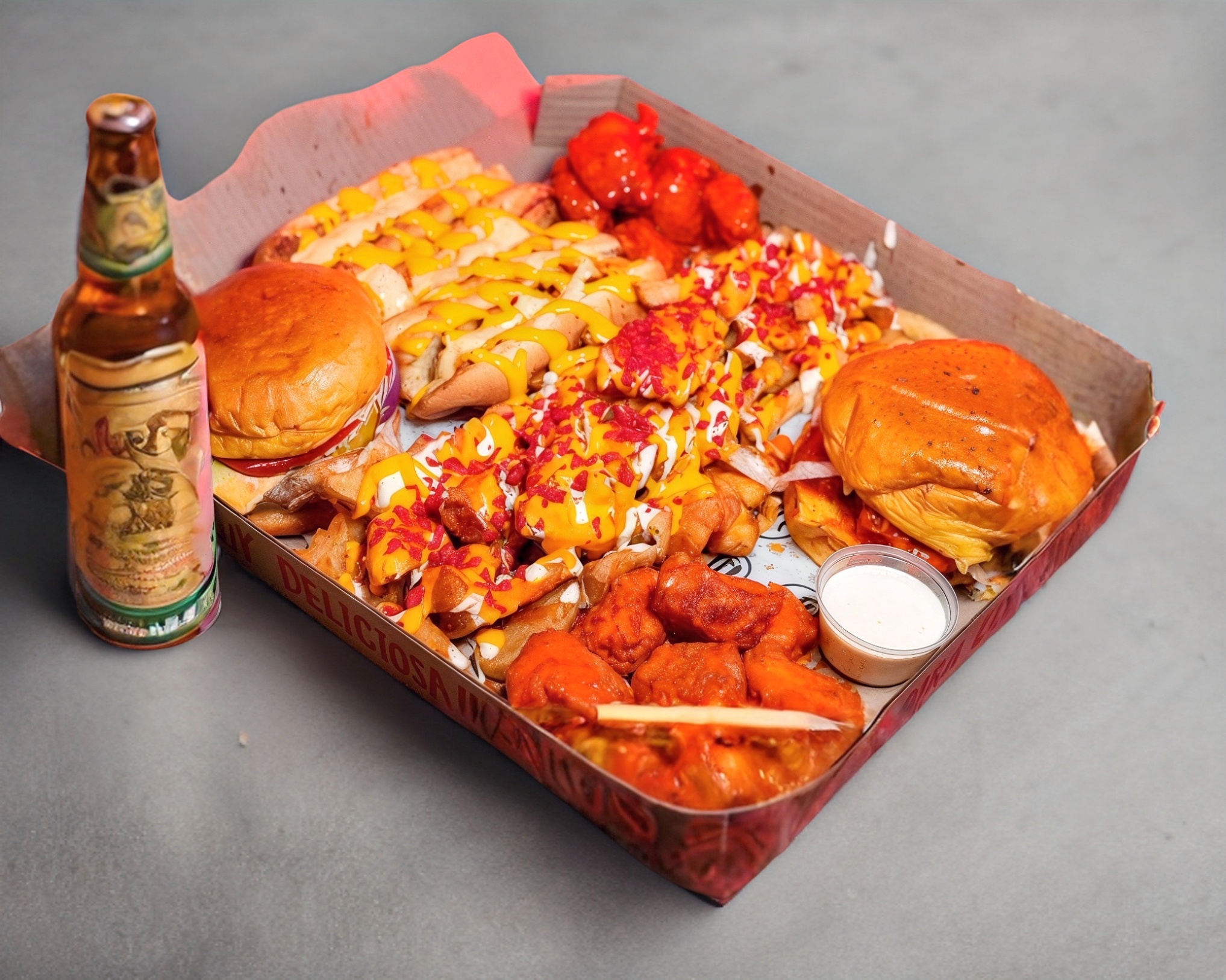 Es un paquete familiar para 4 a 6 personas aproximadamente que incluye 2 porciones de bonnles 1 hercules burger 1 apolo burger 3 hot dogs chicos papa ala francesa, crisscut y gajo todo en una caja.
