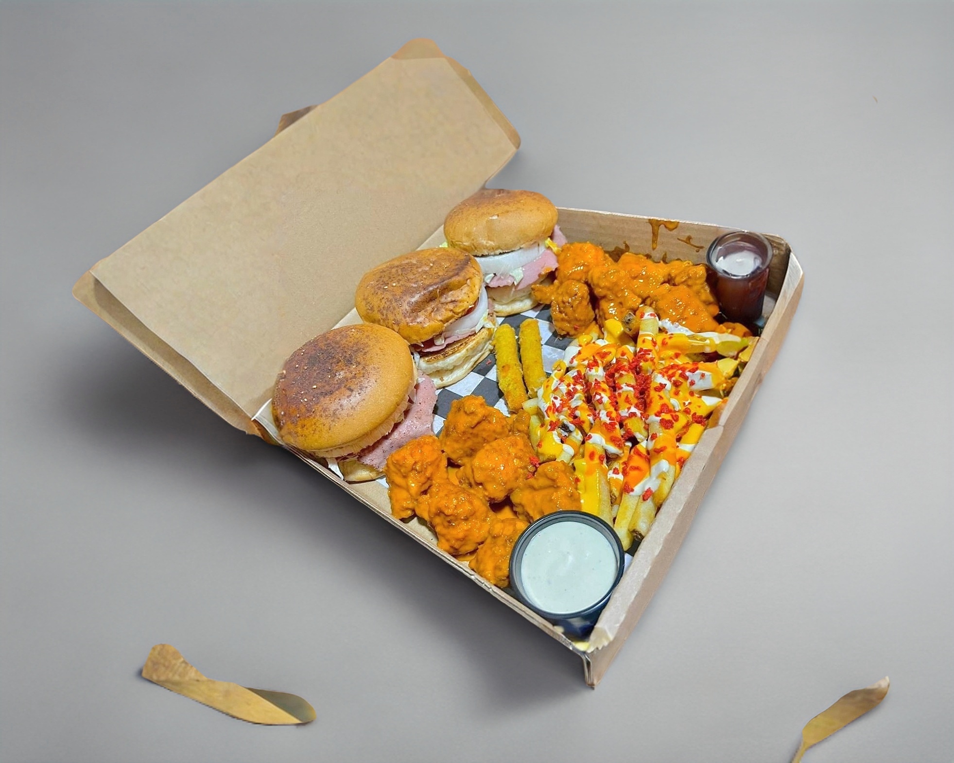 Paquete familiar para 3 personas recomendado por tener 3 tritón burger 2 porciones de boneless frenvh fries y 2 dedos de queso o chell balls.