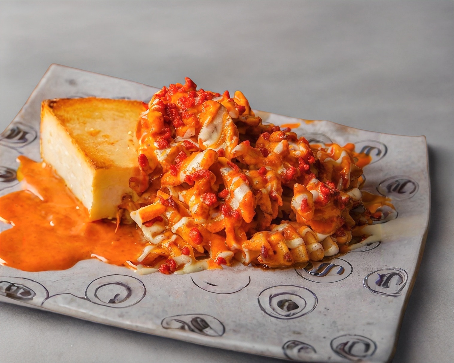Carne arrachera con queso amarillo, pan empanizado de cheetos flaming hot, cheetos por dentro y ranch.