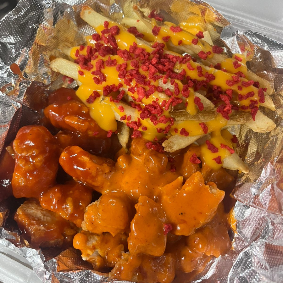 250 gr de boneles bañados en la salsa de tu elección con un aderezo + 150 gr de papas a la francesa