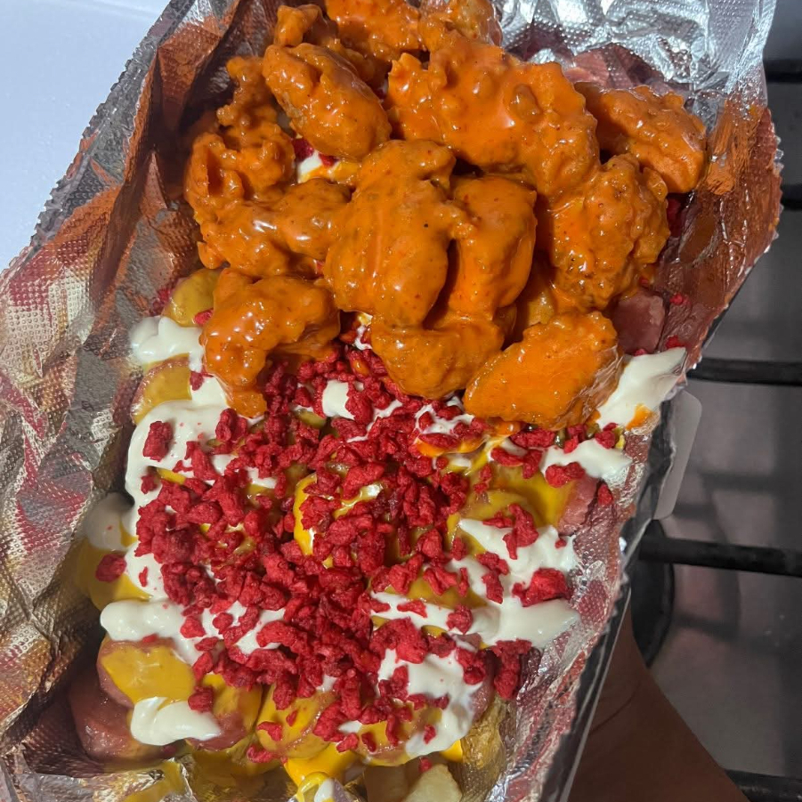 350 gr de papas + 120gr de salchicha de pavo + 160 gr de Boneless Bañados en salsa de tu eleccion
