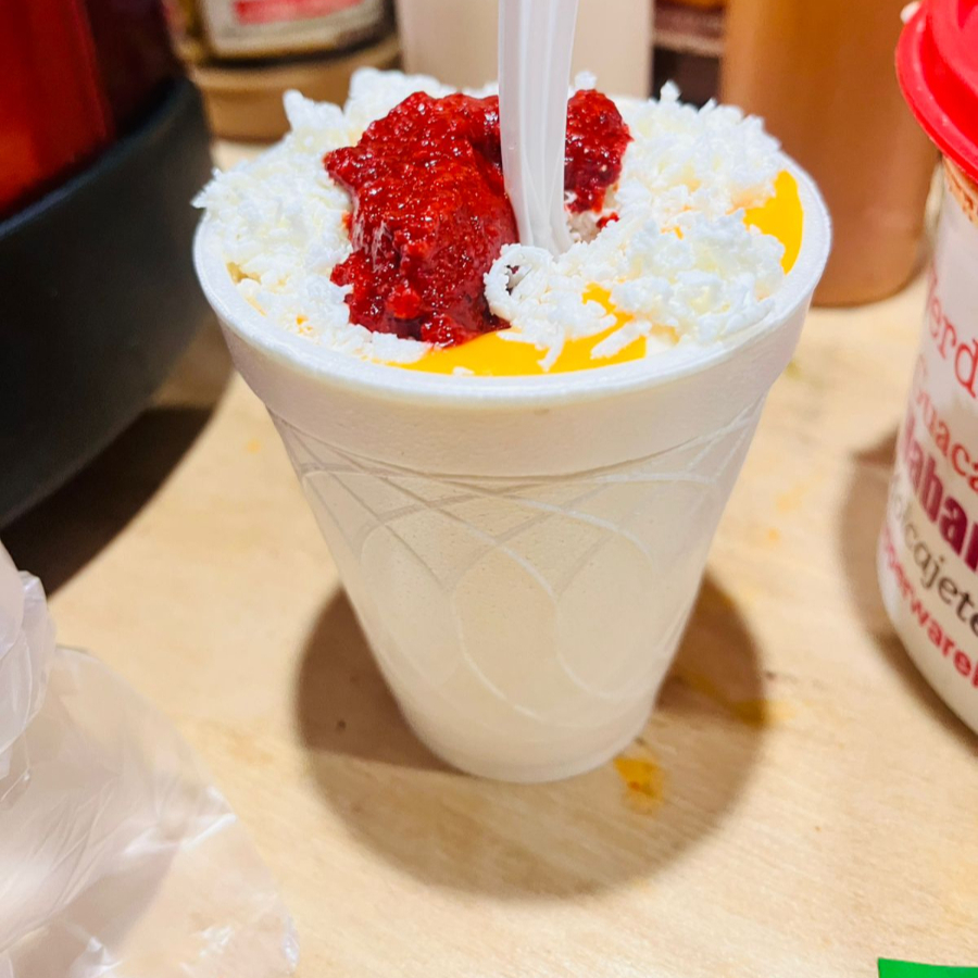 Elote cosido en vaso con los aderezos de tu eleccion puedes cambiarlo a 3 quesos con costo extra