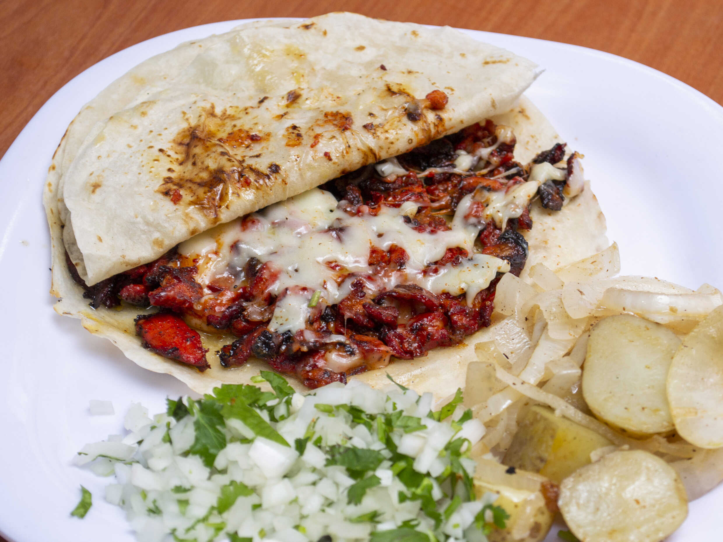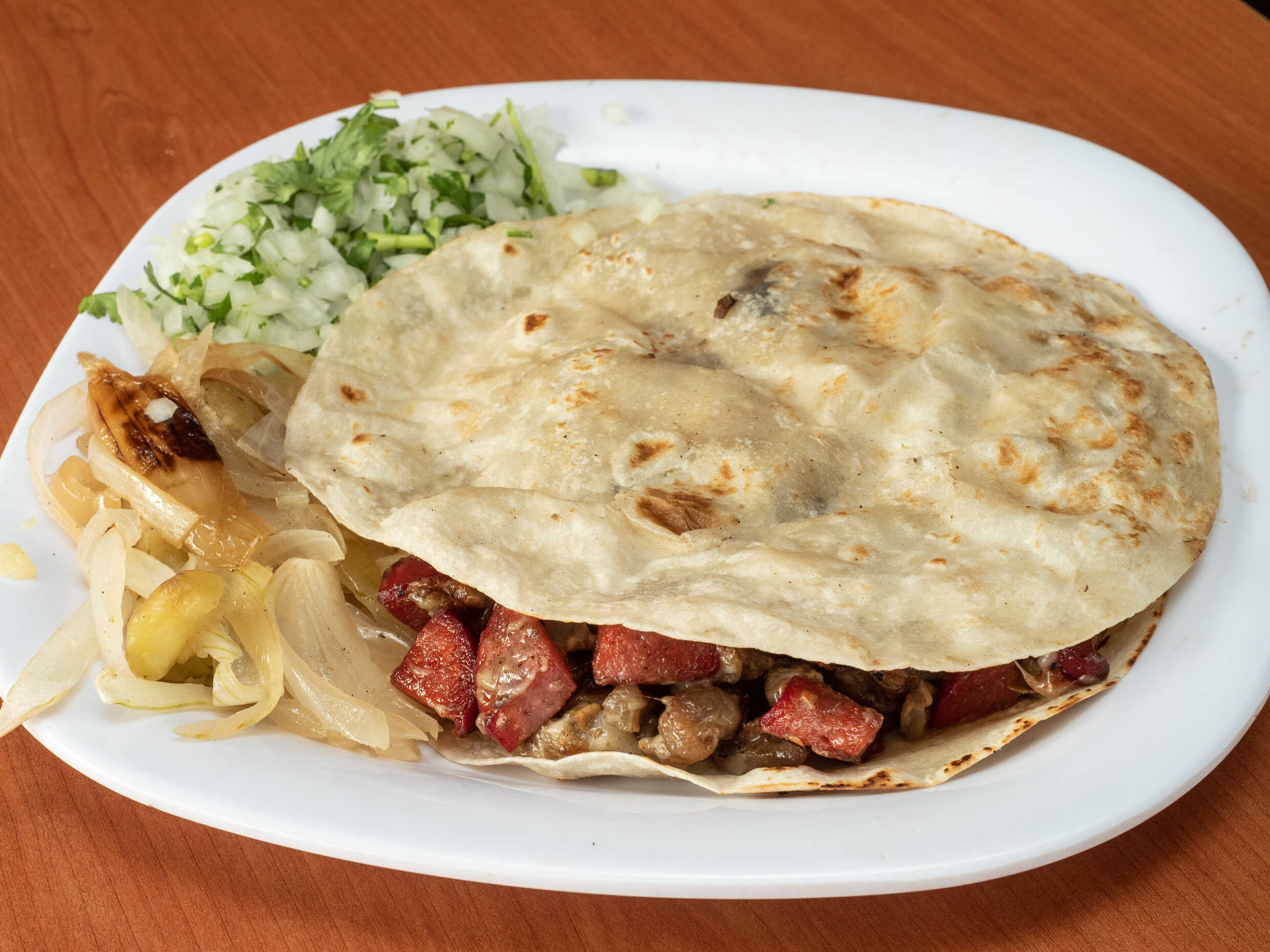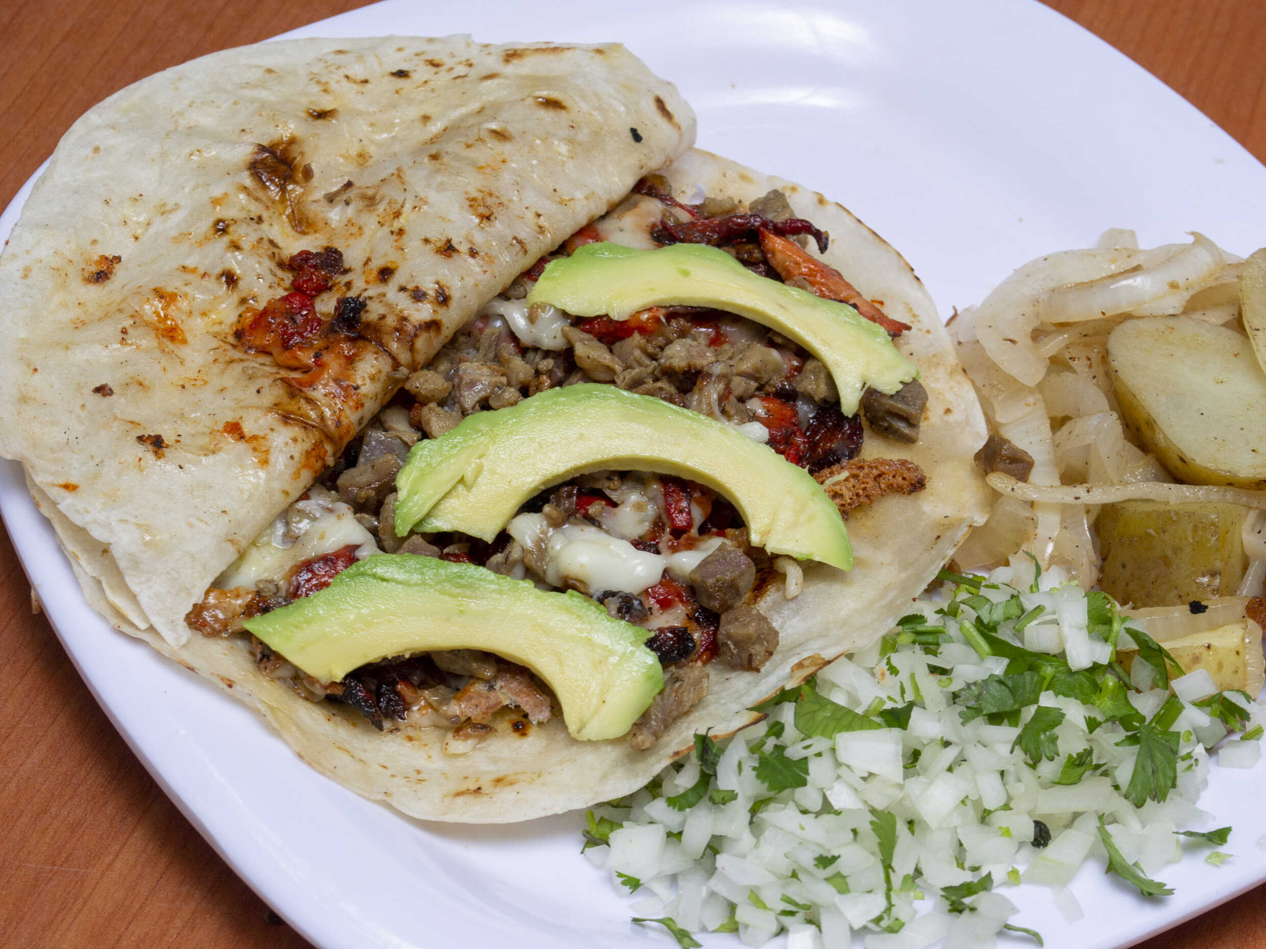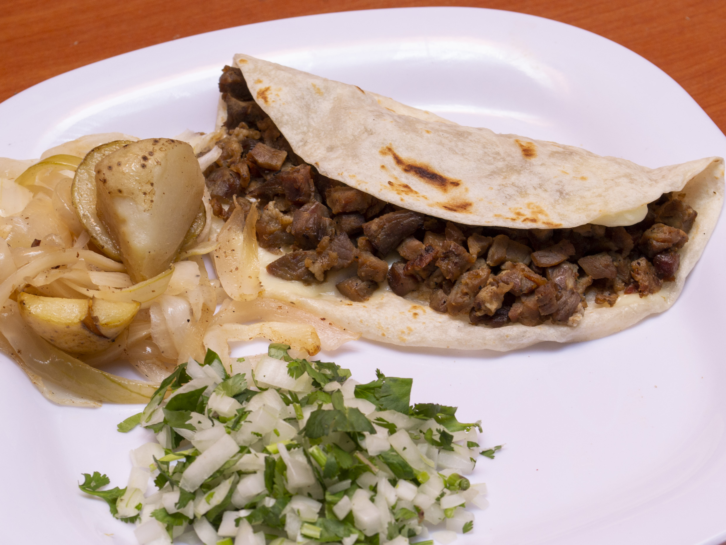 UNA TORTILLA DE HARINA HECHA TACO DE 16 CM CON QUESO OAXACA Y BISTEC