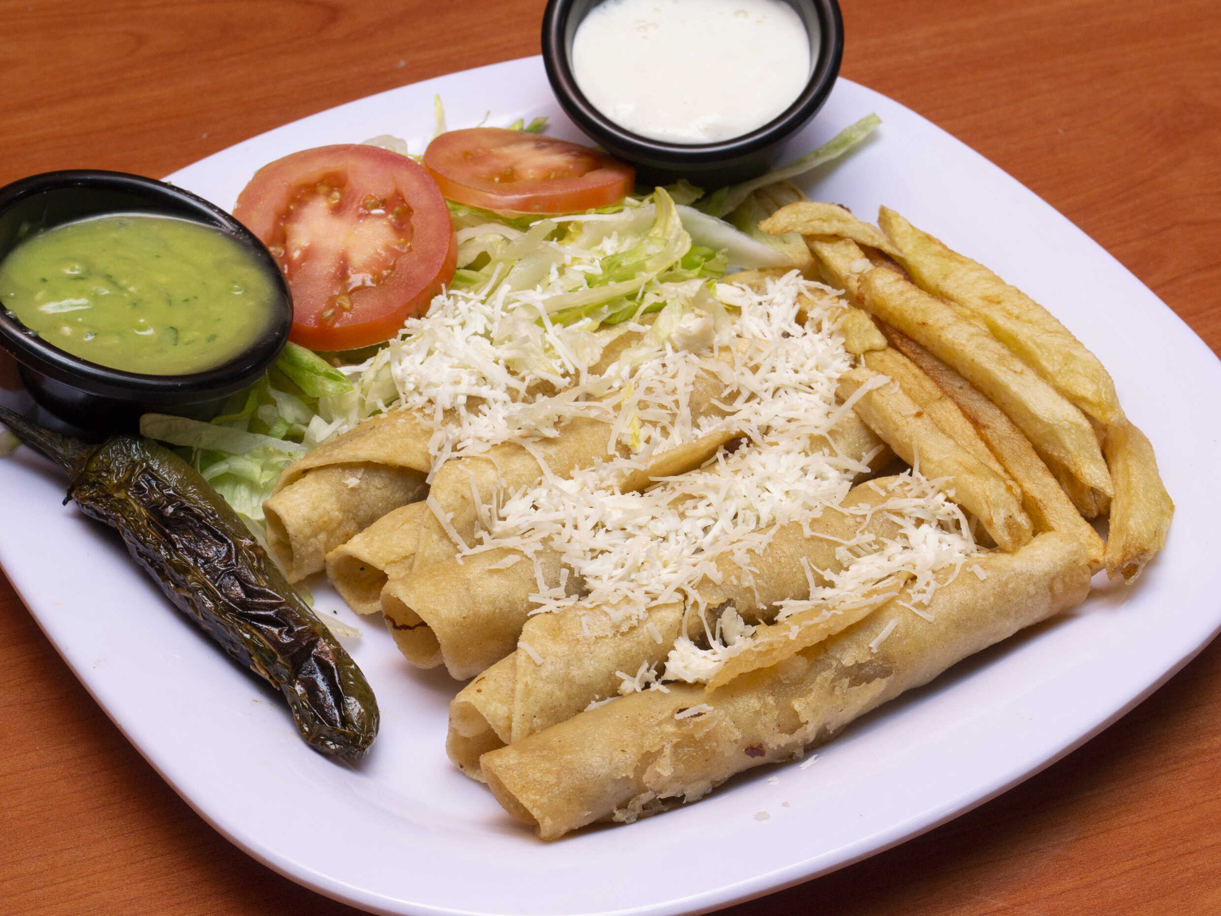 5 pzs de flautas nevdas c/ queso panela y Acompañado de papitas francesas crema y guacamole liquido por separado.