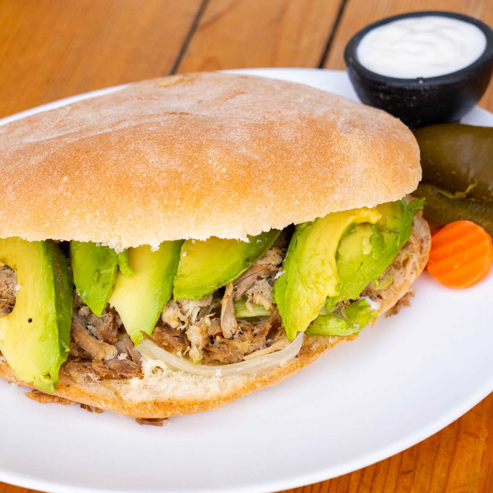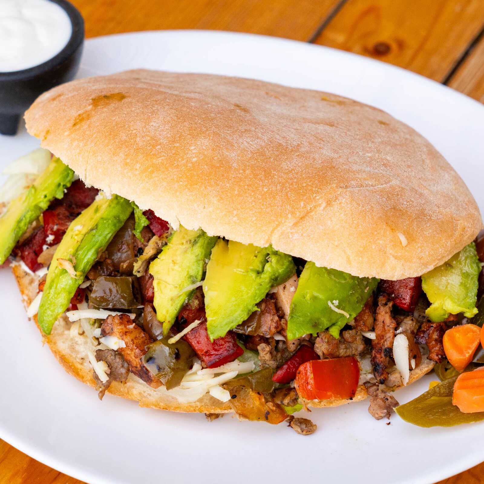 TORTA DE SIRLON Y QUESO CHIHUAHUA AGUACATE CREMA CEBOLLA TOMATE EN TELERA ARTESANAL CASERA