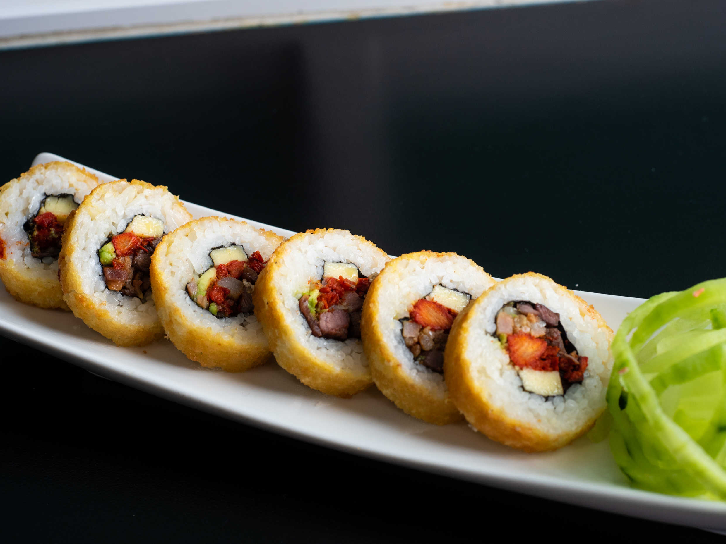 Por dentro aguacate, philadelphia, chile toreado y camarón. Por fuera bañado en salsa spicy y sriracha.