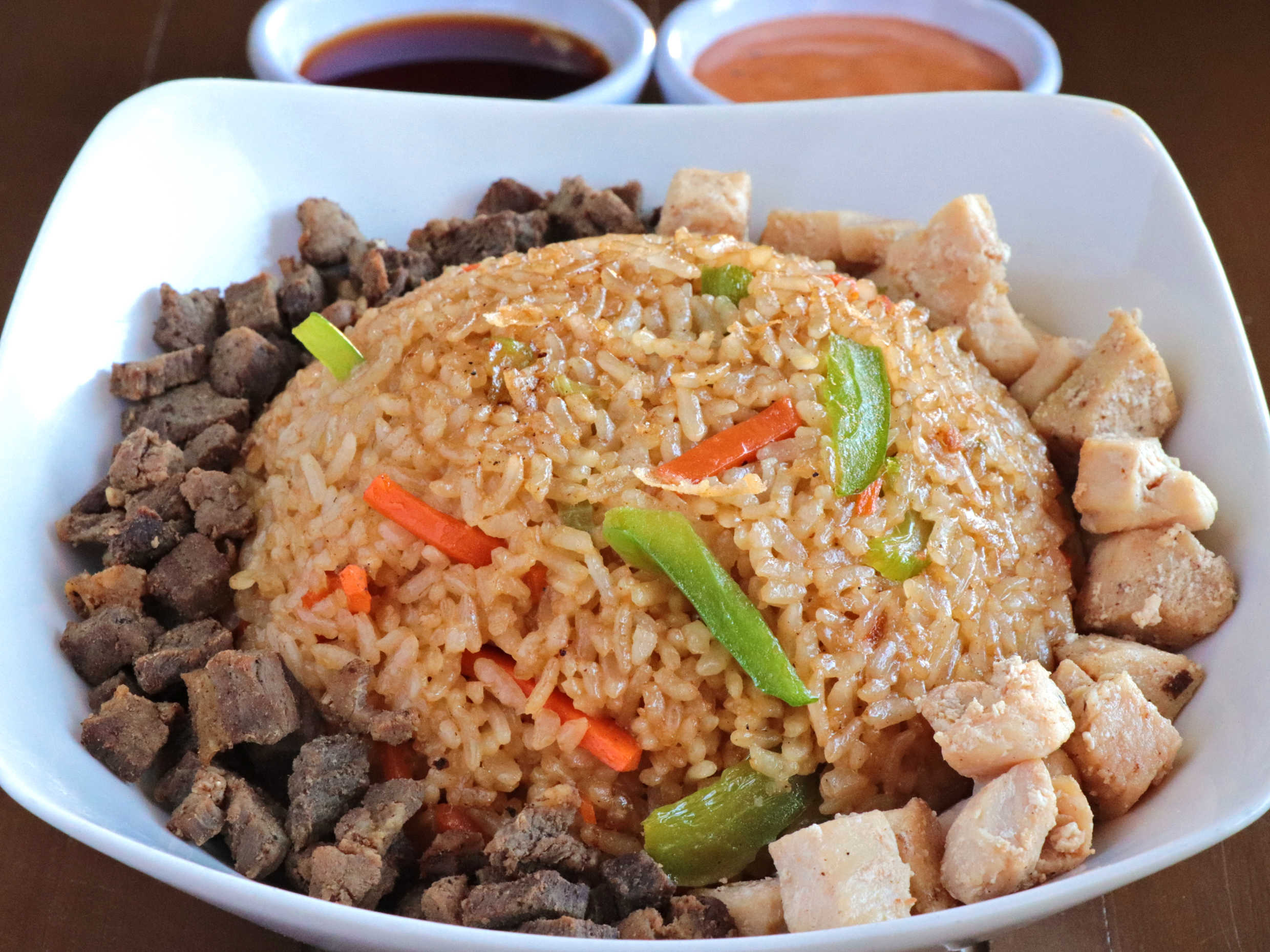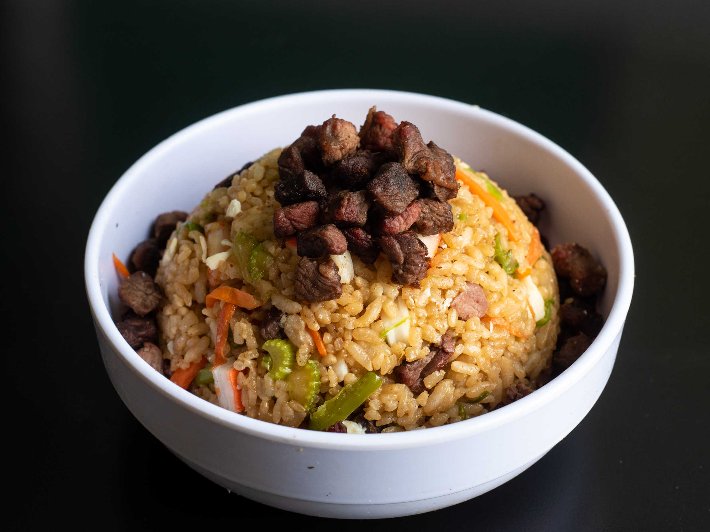 Arroz frito con res, pollo, surimi, camarón, zanahoria, apio y morrón mezclado con salsa de soya preparada.