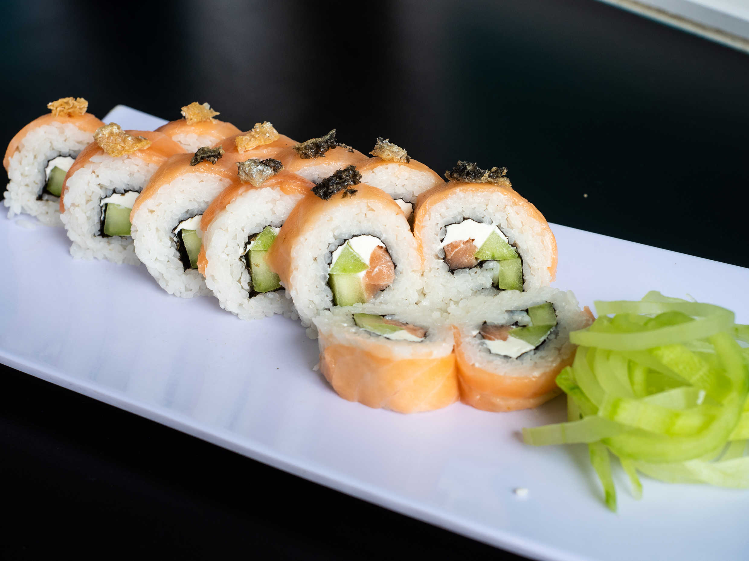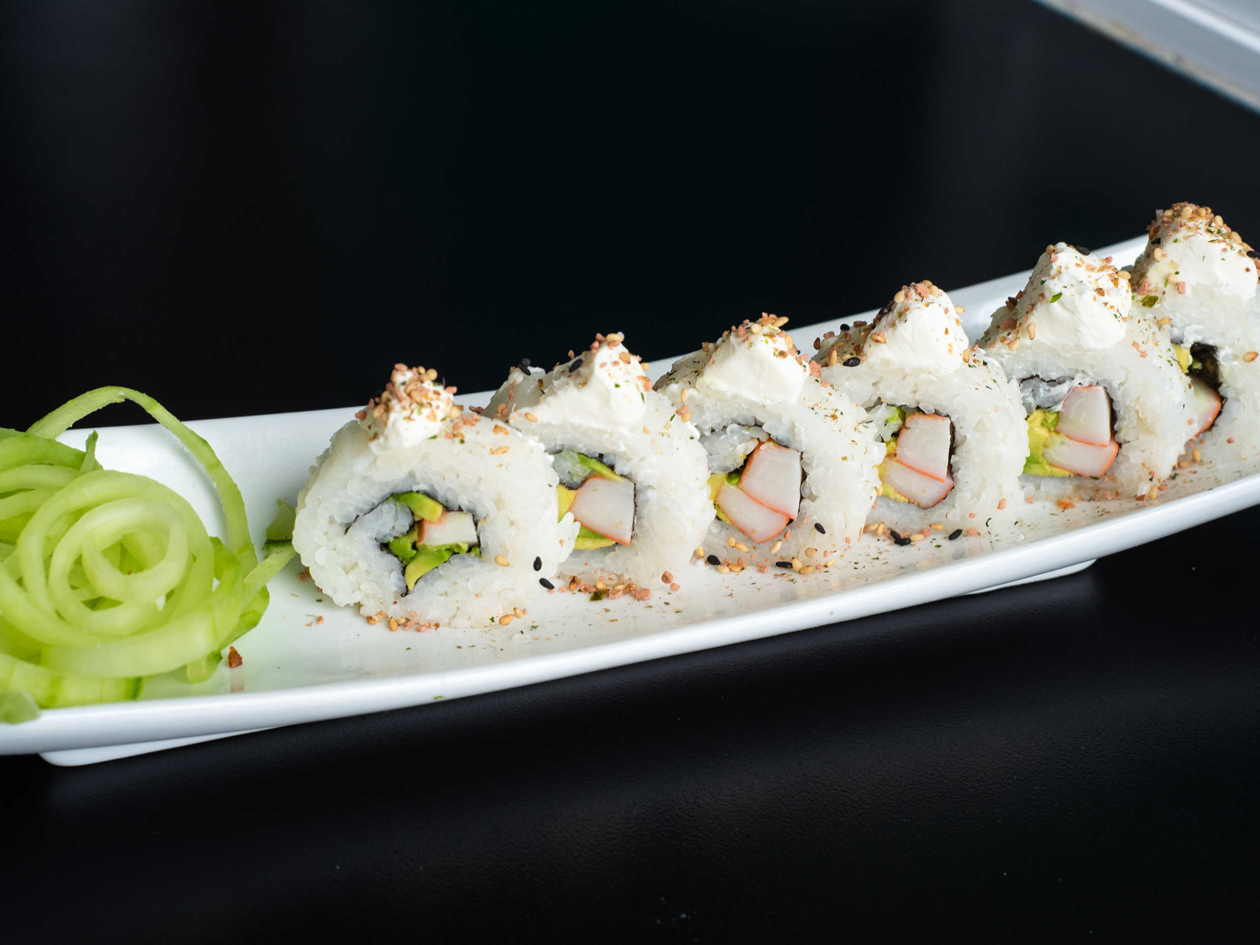 Por dentro aguacate y surimi. Por fuera philadelphia y furikake.