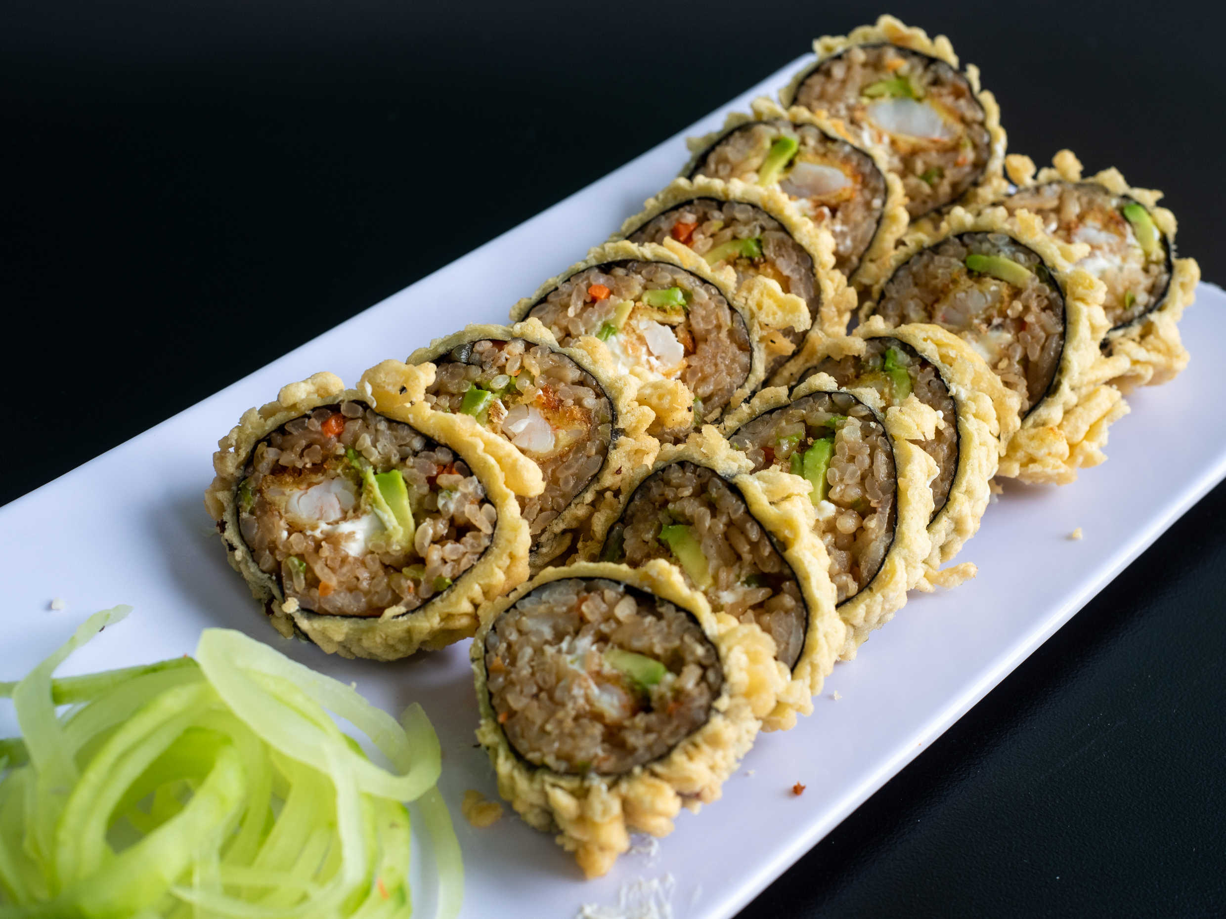 Por dentro arroz frito, aguacate, philadelphia y camarón empanizado. Alga por fuera.